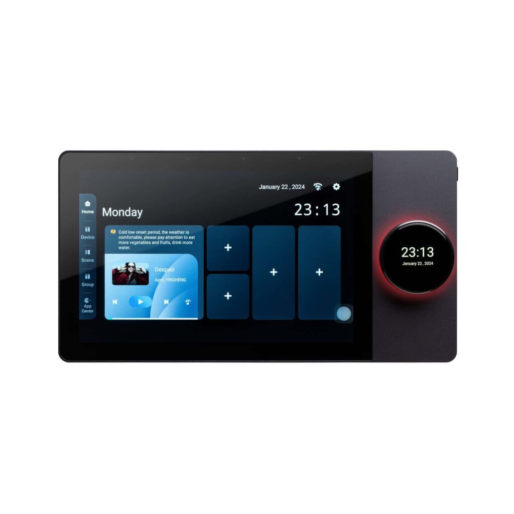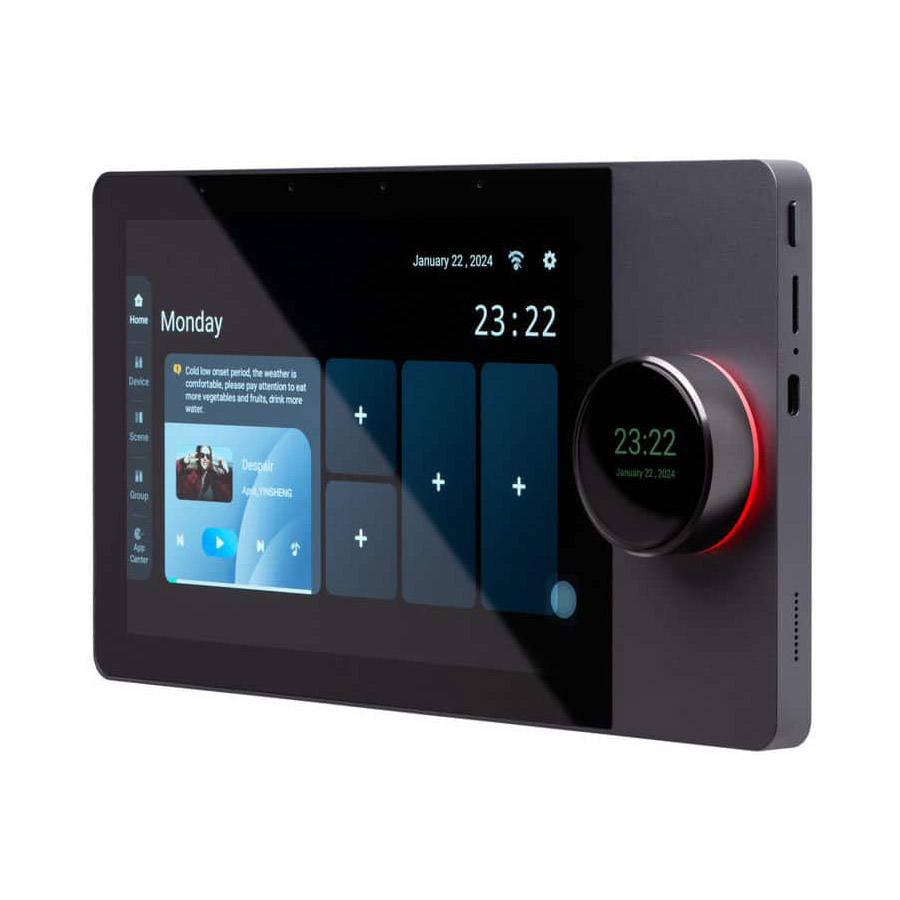 کنترل کننده مرکزی دارای صفحه نمایش ال سی دی 10 اینچی است که به صورت پویا تاریخ و زمان را نمایش میدهد، به روزرسانیهای وضعیت هوا را اعلام میکند و به عنوان دستیار شخصی شما عمل میکند. این کنترلر هوشمند دارای یک کلید چرخشی با صفحه نمایش لمسی 1. 2 اینچی است که آن را برای کنترل میزان صدا یا تنظیم نور چراغها ایده آل میسازد. این دستگاه همچنین به عنوان یک هاب مرکزی عمل کرده و دستگاههای هوشمند شما را به اینترنت متصل میکند و به شما امکان داده تا از هر نقطهای از جهان به راحتی دستگاههای خود را کنترل کنید. با اضافه کردن بلندگو های سقفی، میتوانید از کارت حافظه microSD موسیقی پخش کنید یا از طریق بلوتوث به آن استریم کنید.